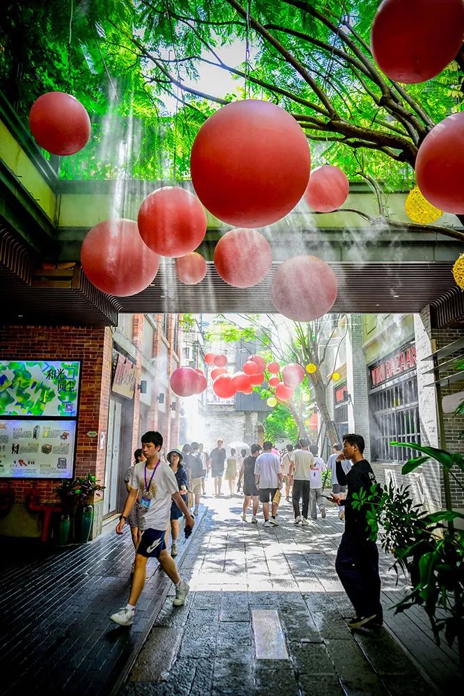 顶光最顶级的场景是丁达尔效应的光。我在过道两侧偶然遇到了喷雾的场景。阳光从上到下直射,穿透了雾气直通的路面。壮观的丁达尔光可以让人停下来观看,红色的大球悬挂在空中也提升了色彩和氛围。