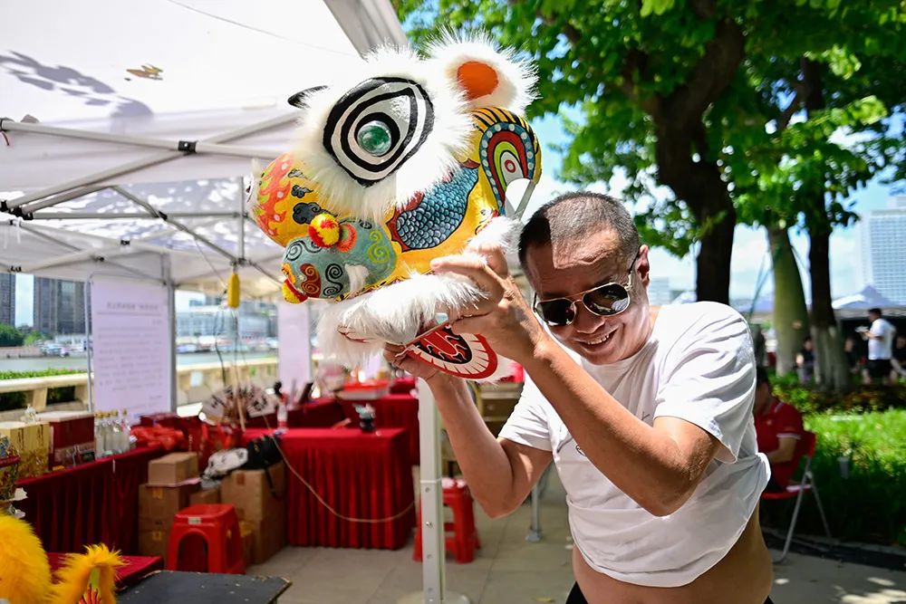 炎热的中午,火辣的太阳在烤大地,我来到非遗市场,游客们正在感受舞狮头饰,如何记录这一刻?背景有点乱。我选择靠近拍摄,夸大了发饰,模糊了背景。这时,尼克尔 Z 26mm f2.8镜头的2.8光圈起着重要作用。准确地将人物与背景分开,在室内环境不理想的前提下,体现了设备的重要性,26mm恰到好处。