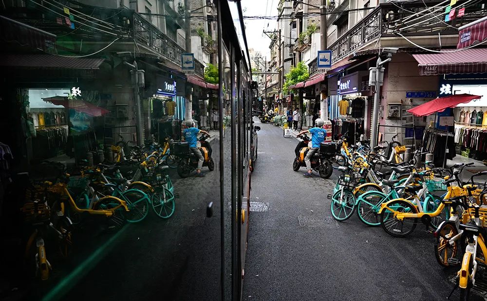 阴天是常见的天气。这种环境的光是我们常说的散射光。此时光源非常平静,没有大的对比和强烈的阴影,但散射光可以给人一种平静的感觉。在堵塞的道路上,我看到这个镜像出现在公共汽车的窗户上,26毫米的广角正好把我看到的内容纳入画面。这张照片几乎是盲拍,但是在熟悉了固定焦距之后,视觉已经形成了固定的分析范围,所以盲拍的成功率还是很高的。