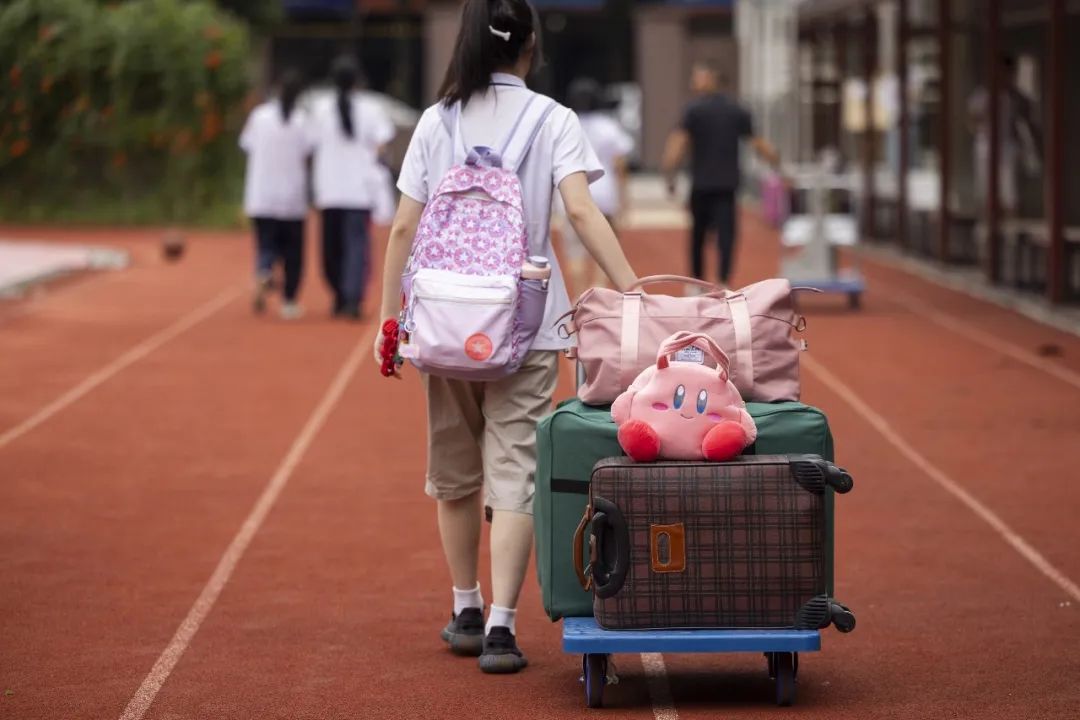 新学期于2022年8月31日开始,住校学生拖着行李返校。