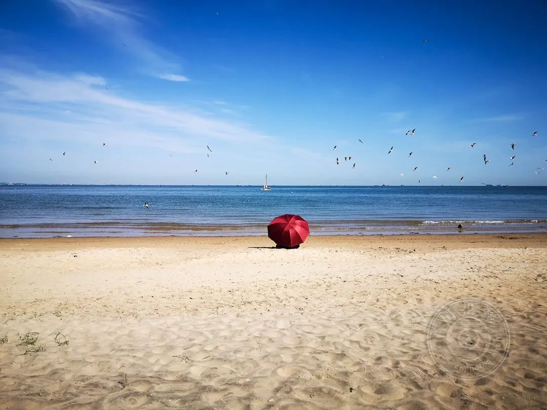 2023年10月6日,拍摄于河北秦皇岛北戴河海滩。沙滩上有一把红伞,也许伞下的人都在等着出海归来。