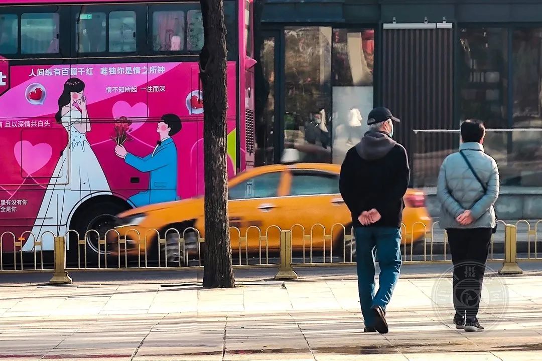 两个老夫妇同时背着背影,左边大巴车身上的彩绘反映了他们昨天的身影。
