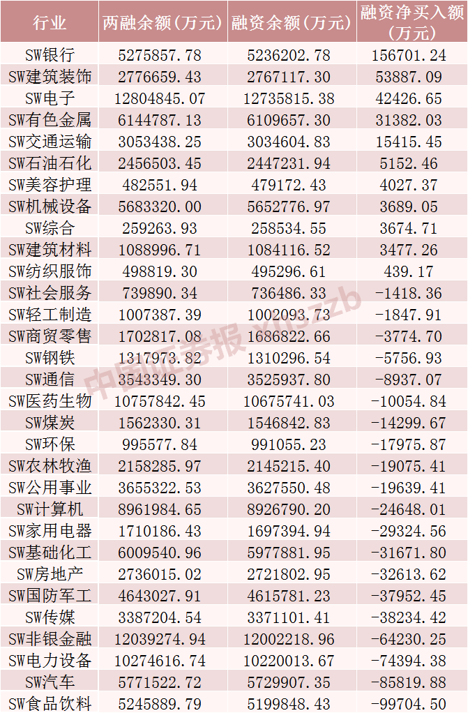 在融资余额下降的20个行业中,食品工业、汽车、电力设备行业的融资余额下降分别为9.97亿元、8.58亿元和7.44亿元。