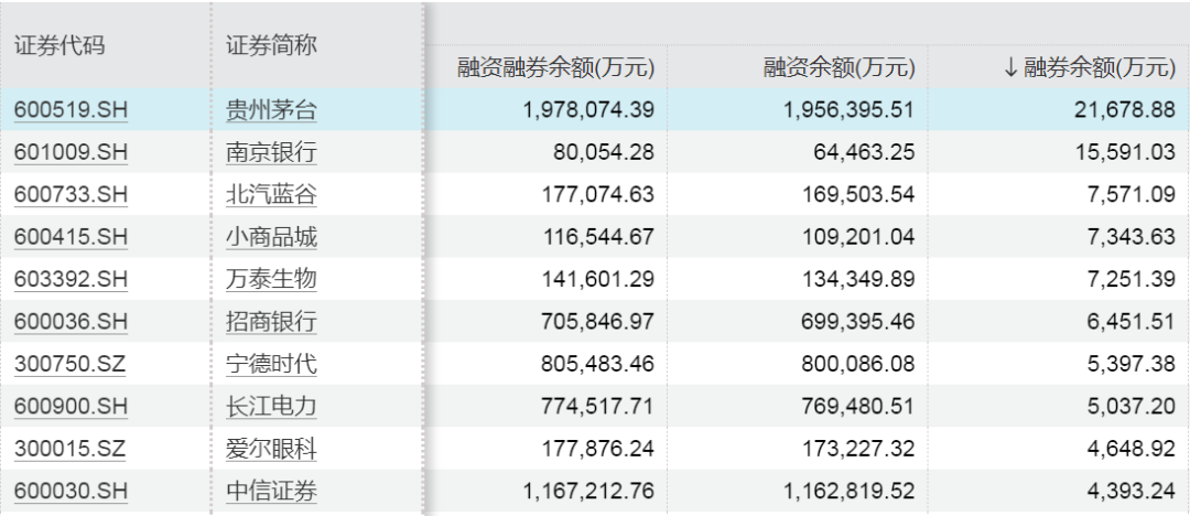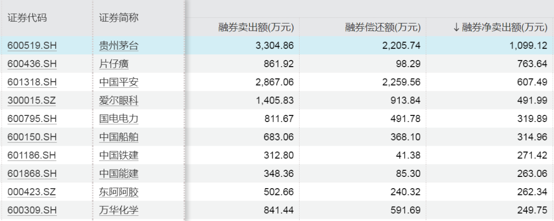 贵州茅台、片仔癀、平安上周融券净卖出额居前,分别为1099.12万元、763.64万元、607.49万元。