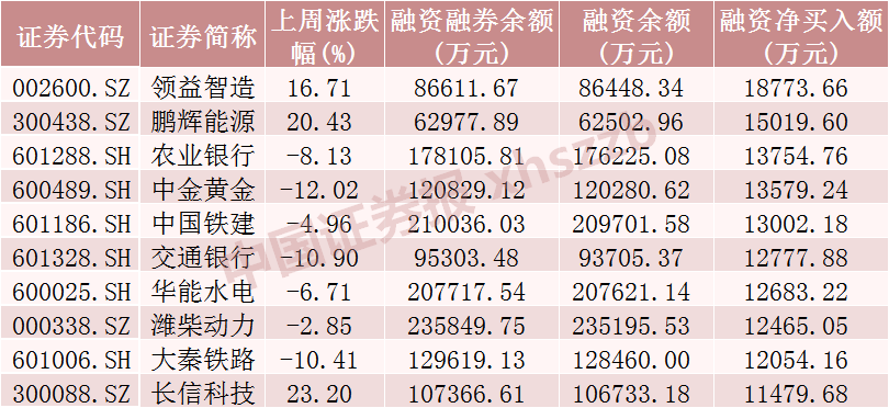 从个股情况来看,上周融资者加仓前10只股票分别是智能创作、鹏辉能源、农业银行、中金黄金、中铁建设、交通银行、华能水电、柴蔚动力、大秦铁路、长信科技。各自净买入1.88亿元,1.50亿元,1.38亿元,1.36亿元,1.30亿元,1.28亿元,1.27亿元,1.25亿元,1.21亿元,1.15亿元。
