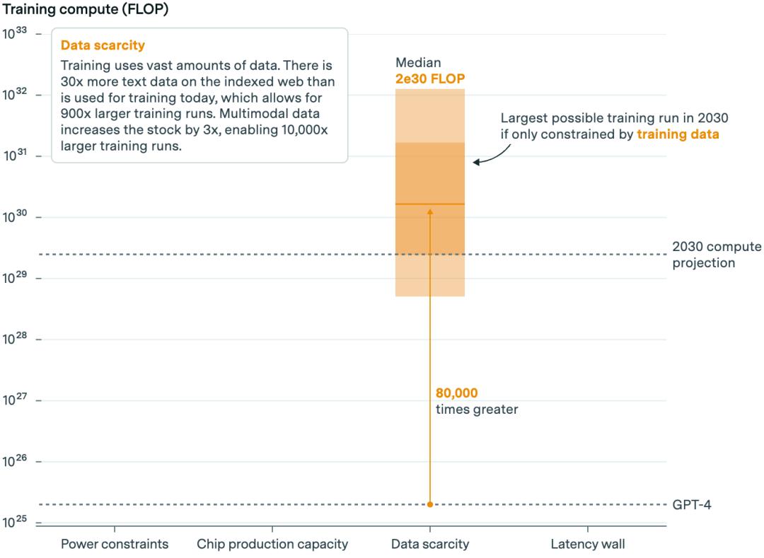 众所周知,人工智能对数据的渴望和即将到来的稀缺是一个限制因素。有人预测,到2026年,将会缺乏高质量的公开数据流。但是Epoch认为,数据稀缺不会阻碍模型的发展,至少在2030年之前。。