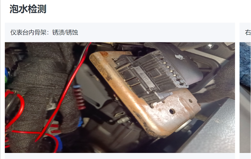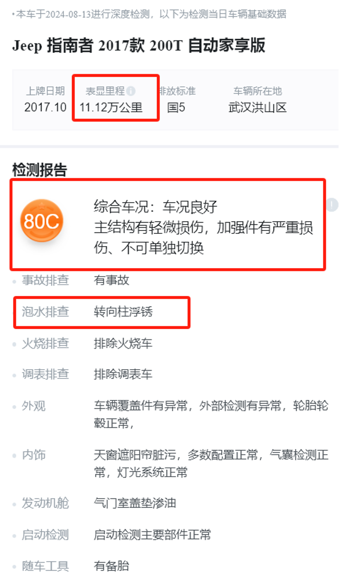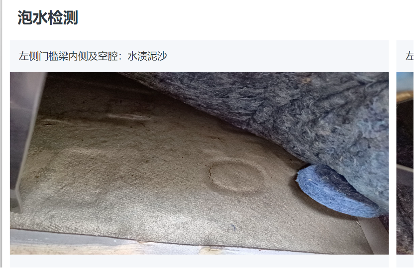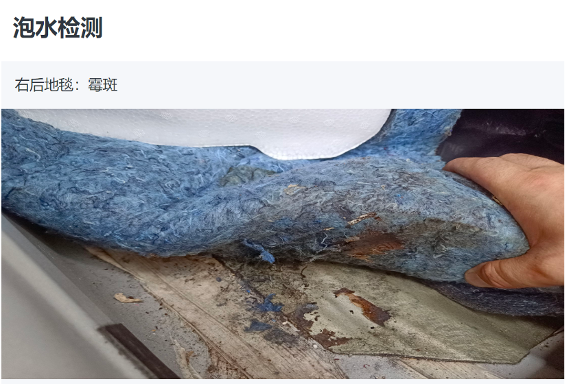 根据余先生今年8月份瓜子二手车发布的官方检验报告截图,该车事故调查中的一项是“事故”,其中一项是“转向柱生锈”。浸泡检查显示右后地毯有霉斑,仪表盘内框架生锈/生锈,左门槛梁内侧和内腔有水痕泥沙。
