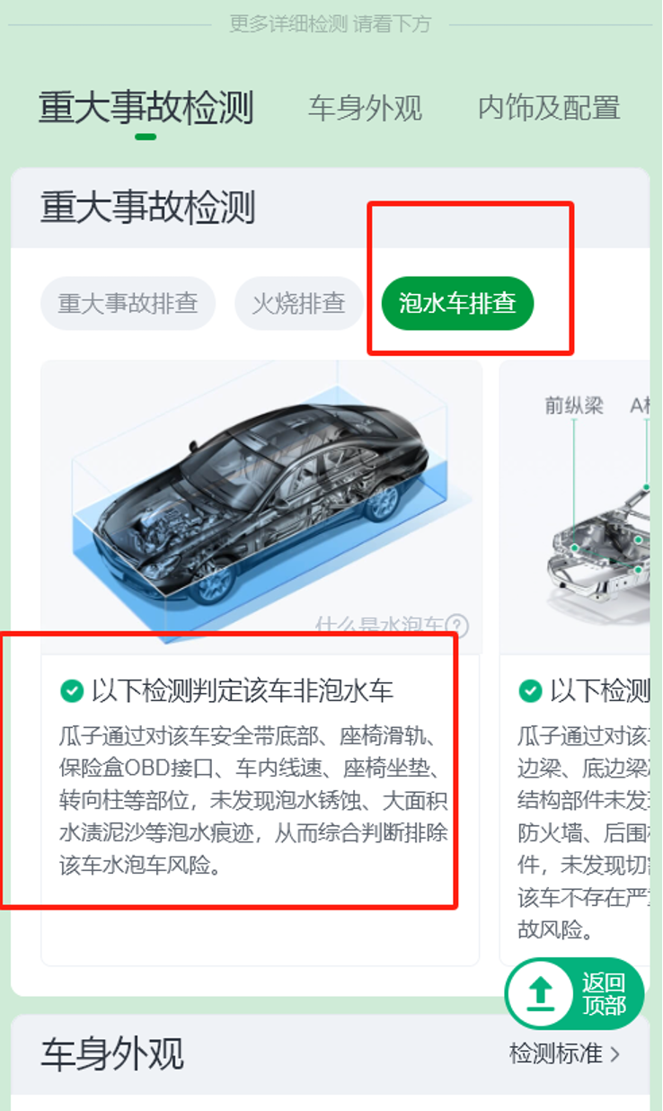 在这场争议中,该报联系了瓜子二手车。据工作人员介绍,8月份检验报告的观点是由检验人员上传车辆照片后系统判断的。“如果最终判断这款车在消费者选择之前有水泡嫌疑,平台承诺终身退货。”