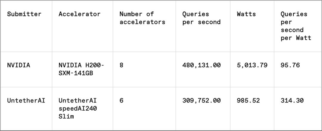 英伟达以单个加速器为前提。 Blackwell 唯一参与芯片的基准测试——LLM 在问答任务中,性能高于所有之前的芯片。 2.5 倍。Untether AI 的 2400speedAI24 在其参与的唯一任务——图像识别中,浏览芯片的性能几乎与 H200 持平。谷歌的 Trillium 图像生成任务中的性能大概是? H100 和 H200 的一半,而 AMD 的 Instinct 在 LLM 性能和问答任务 H100 大致相当。