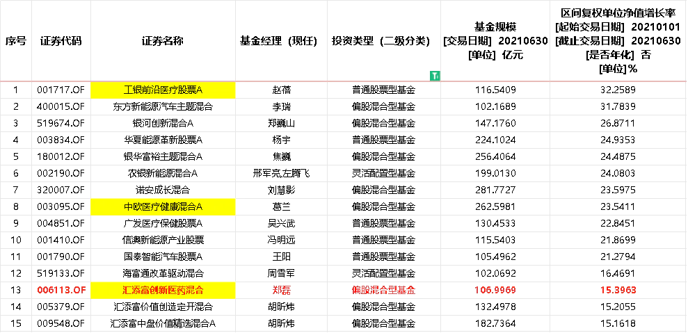 2021年上半年,由明星基金主管郑磊管理的汇添富创新药业混合基金规模为106亿元,年净增长率约为15.39%,在医药行业超过100亿规模的主动权益净增长中排名第三,紧跟赵蓓、葛兰,深受市场青睐。