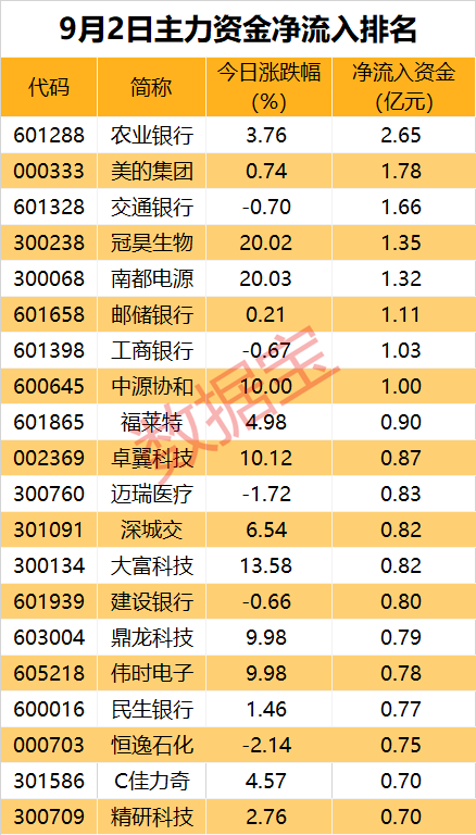就个股而言,7只个股获得主力资金净流入超过1亿元。农业银行净流入额度居首,达到2.65亿元,全天成交额为31.77亿元,换手率为0.21%。