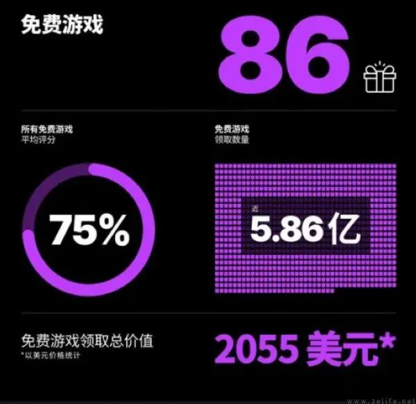 基于Epic 根据Games历年公布的年度回顾,从2019年到2023年,Epic游戏商城分别发布了73款游戏、103款游戏、89款游戏、99款游戏和86款游戏,而玩家收到的游戏拷贝总量已接近50亿份。换言之,Epic游戏商城几乎给了世界上每个人一个游戏。因此,“免费游戏”现在也成了Epic游戏商城的一大标志。