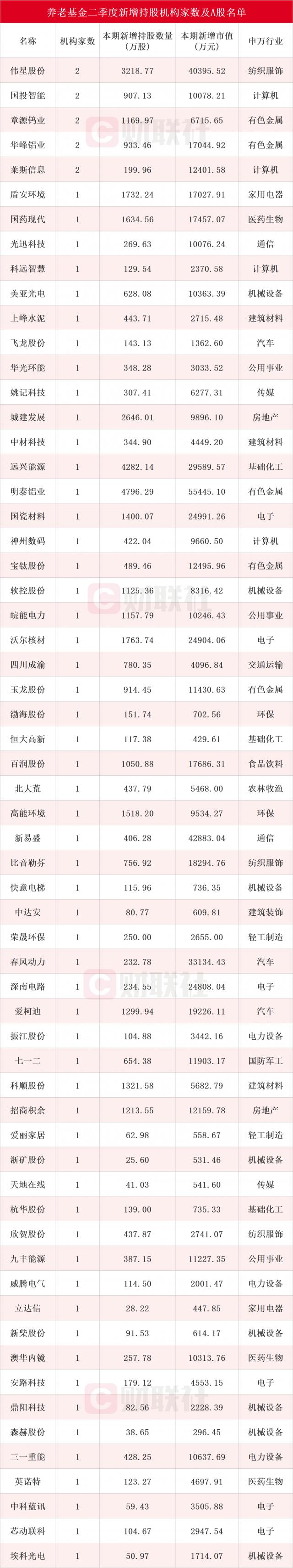 根据最新的持股趋势, Choice 数据显示,第二季度新进入养老基金 61 个股前十大流通股股东名单。其中,伟星股份、国投智能、章源钨业、华丰铝业、莱斯信息获得养老基金新增持仓数量均为 2 家。