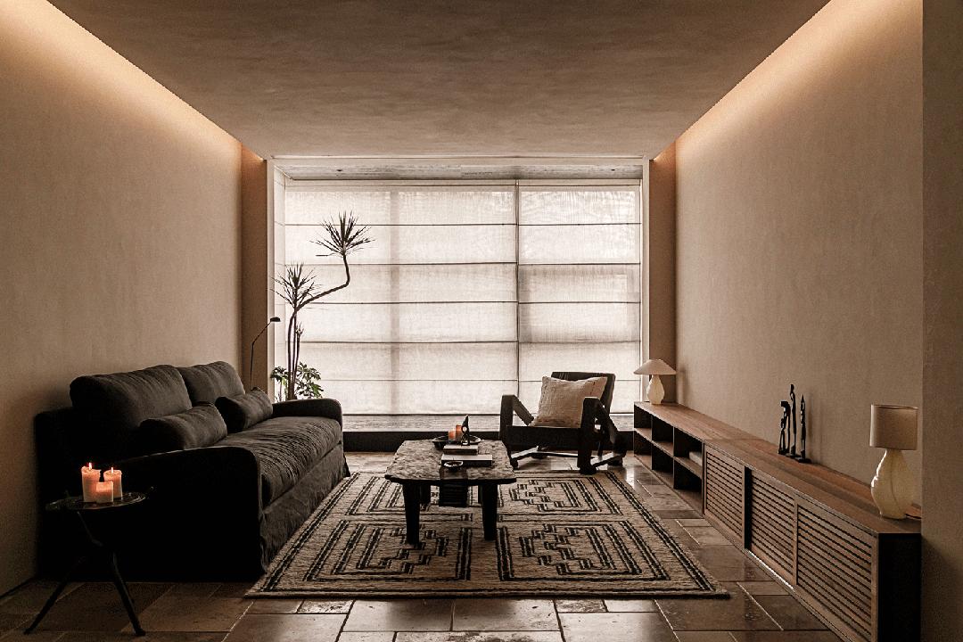 整个房子没有主灯设计。自然光源用灯带和灯膜涂抹,再结合墙壁粘土的质感,会给空间一种放松的感觉,营造出与世隔绝的氛围。