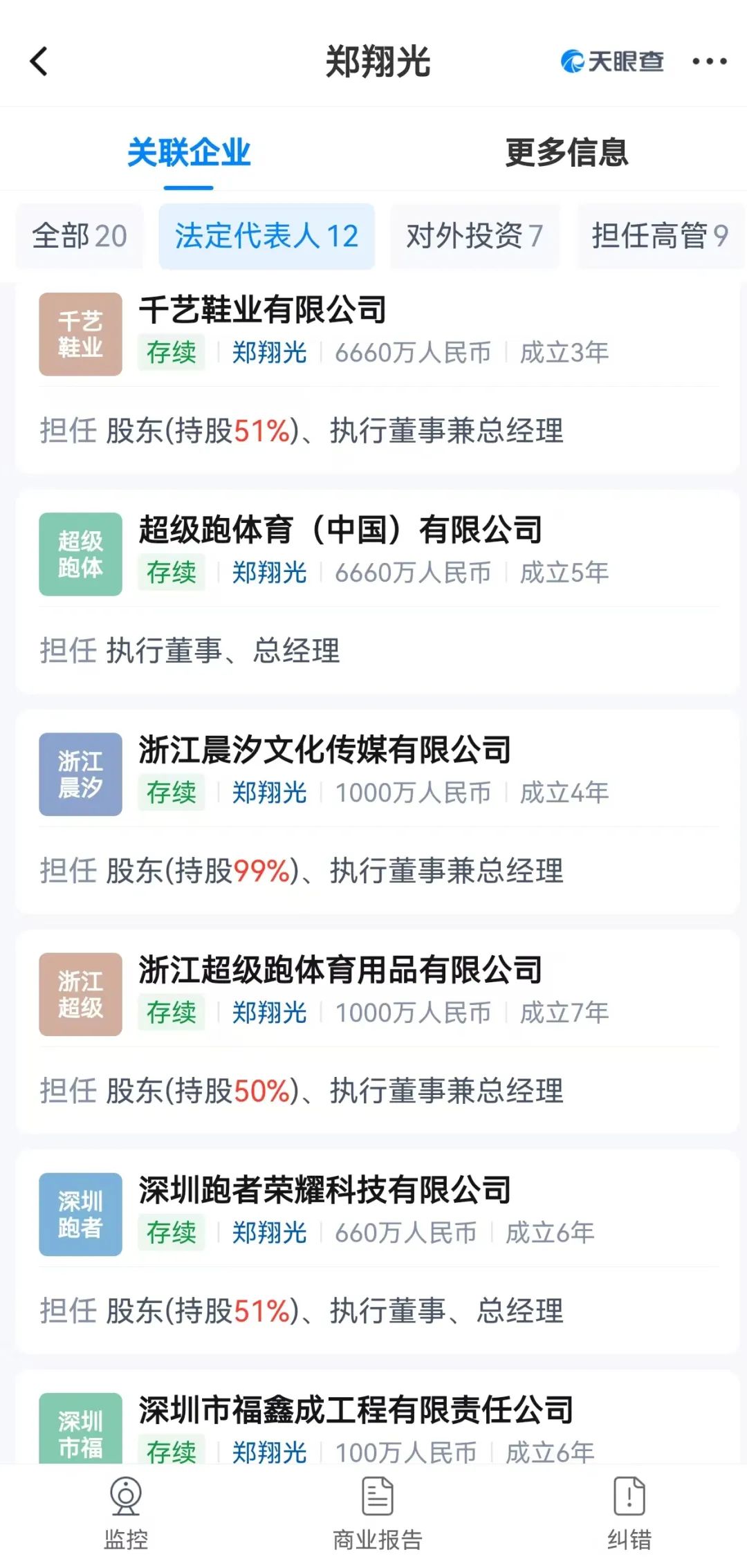 她们夫妇,还共同持有多家公司。比如千艺鞋业,非常跑体育,跑者荣誉科技等等。