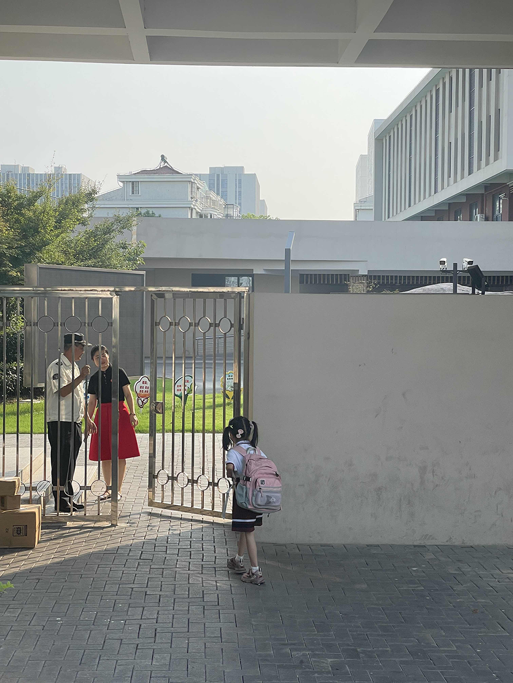 九里亭外国语实验学校,保安在门外迎接学生。本报记者邓玲玮图图