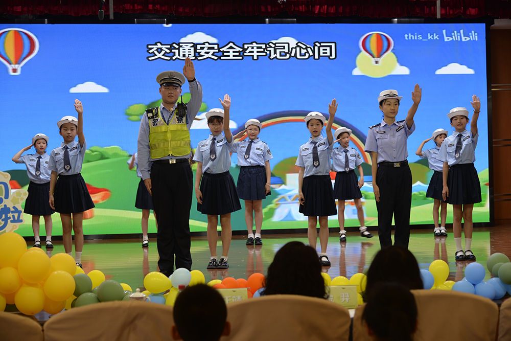 开学第一节课结束时,警方带领全体学生成为交通安全手势练习,希望通过趣味活动加深学生对交通安全知识的印象,提高学生的参与度和主动性。
