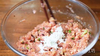 1. 早期浸泡干香菇 10 分钟,泡好的香菇切丁,加入香菇水,加入肉馅中搅拌,加入葱姜末,搅拌均匀。