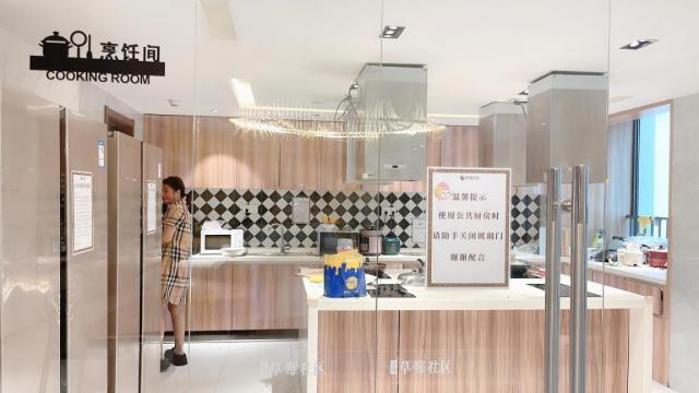 走进金地草莓公寓的党群服务站,立刻感到安静和温暖。墙上挂满了励志海报,开放式厨房区传来阵阵饭香。几个年轻人正在喝咖啡,讨论他们周围有趣的事情。