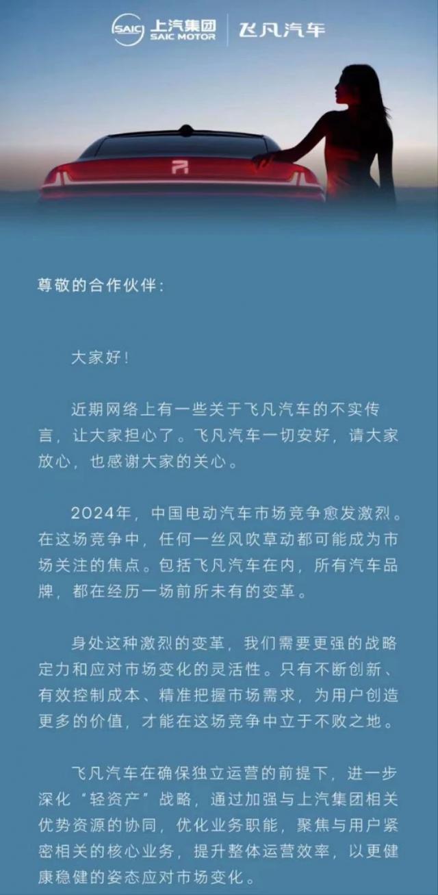 当时,飞凡汽车还在公告中提到了下一个变化:通过加强与SAIC集团相关优质资源的协调,进一步深化“轻资产”战略,提升业务功能,聚焦与用户密切相关的核心业务,提高整体运营效率,以更健康稳定的态度应对市场形势。