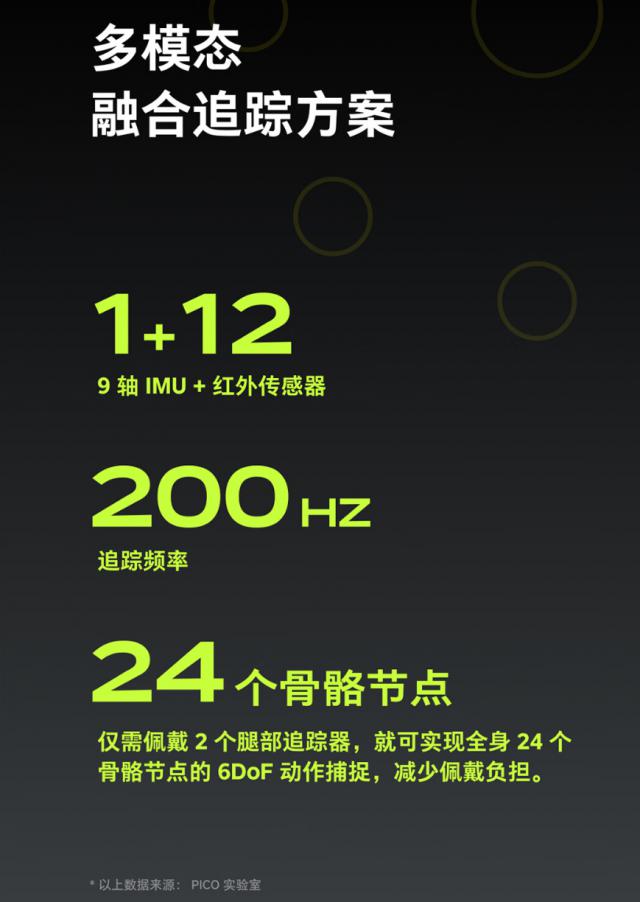 据报道,这个体验追踪器接入 VRChat,搭载 1 颗 IMU 传感器和 12 一个红外传感器,跟踪频率 200Hz,同时内置 PICO 自研 AI 跟踪算法,支持全身动作捕捉。