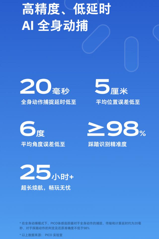 官方表示,PICO 体验追踪器全身动作捕捉延时约 20 ms,平均位置误差约 5 平均视角偏差约为厘米。 6 度数,脚踏识别精度≥ 98%,续航超 25 小时。