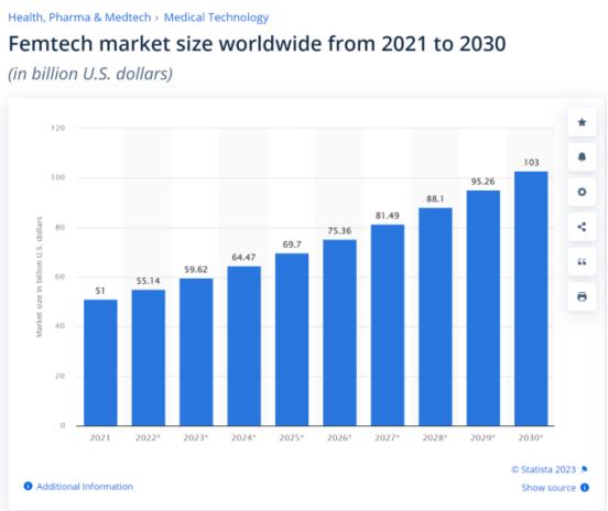 根据statista的数据,2021年,全球女科技市场价值约为510亿美元。预计到2030年,全球女科技市场价值将达到1030亿美元,2022-2030年复合年增长率为8.1%。