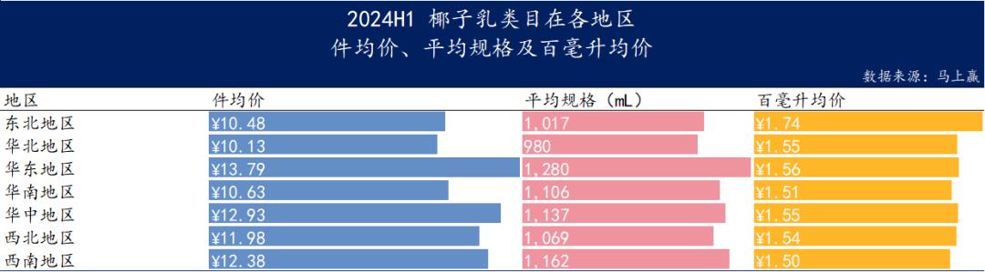 就地域分布而言,华东、华南、华中椰子乳产品的市场份额明显高于东北、华北、西北地区,并且在2024H1比2023H2有所上升;在华东地区,椰子乳件均价最高,但在东北地区,每百毫升均价最高。