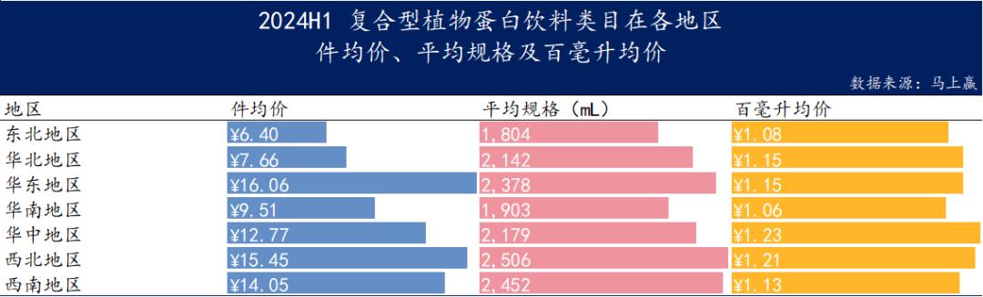 根据价格分析,华东地区复合植物蛋白饮料件均价最高,而华中地区则出现了每百mL均价最高的。
