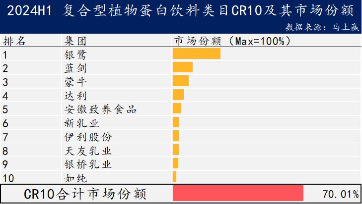 在6个子品类中,复合型植物蛋白饮料产业集中度最低,CR10 只有70%左右。其中,TOP1银鹭集团的市场份额约为25%,其次是蓝剑集团和蒙牛,以唯怡为主要品牌。
