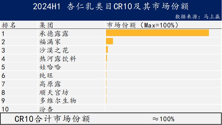 杏仁乳品类也表现出高度集中的特点。TOP1集团承德露露近90%的市场份额领先同类产品;虽然福满家排名第二,但与承德露露相比,市场份额差距明显。