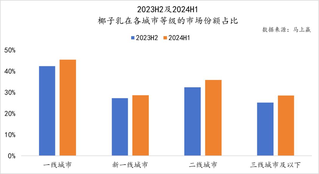按照城市等级,椰奶在一线城市的植物蛋白饮料市场份额明显高于其它地区。与2023年H2和2024年H1相比,每个城市的等级都受到一定程度的节日礼物的影响,但总体份额变化不大。