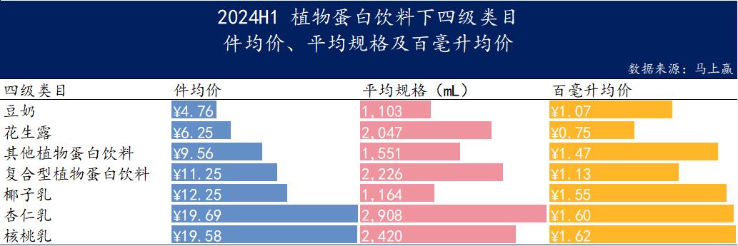 在植物蛋白饮料类别下,各四级类别的零件均价、百mL均价和均价规格如下: