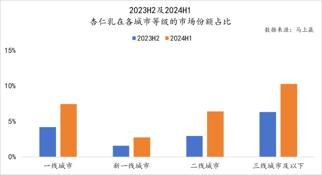 按照城市等级,杏仁乳在一线和三线城市的市场份额明显高于其它地区,而且在不同地区都有所上升。
