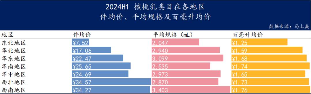 从价格分析来看,西南地区豆奶零件均价最高,平均规格最大;东北地区的每个地区 100mL均价最高,平均规格最小。