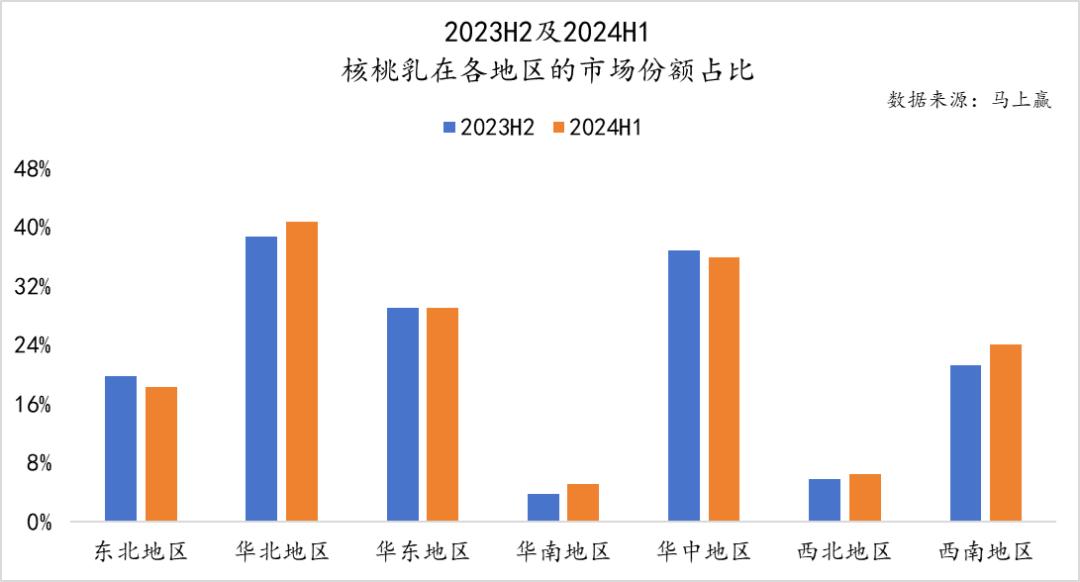 就地域分布而言,华北、华中、华东地区的核桃奶商品市场份额明显高于华南、西北地区,特别是华北地区,在市场份额最高的前提下,2024H1仍高于2023H2,市场份额约为40%,反映出作为河北品牌,六个核桃在本营依然强势。从价格上看,西南地区核桃乳件均价最高;华南地区出现了每100mL均价最高的。总的来说,核桃奶在不同地区的市场份额和价格表现存在显著差异。总的来说,华北、华东、华中在市场份额和价格上都有优势。