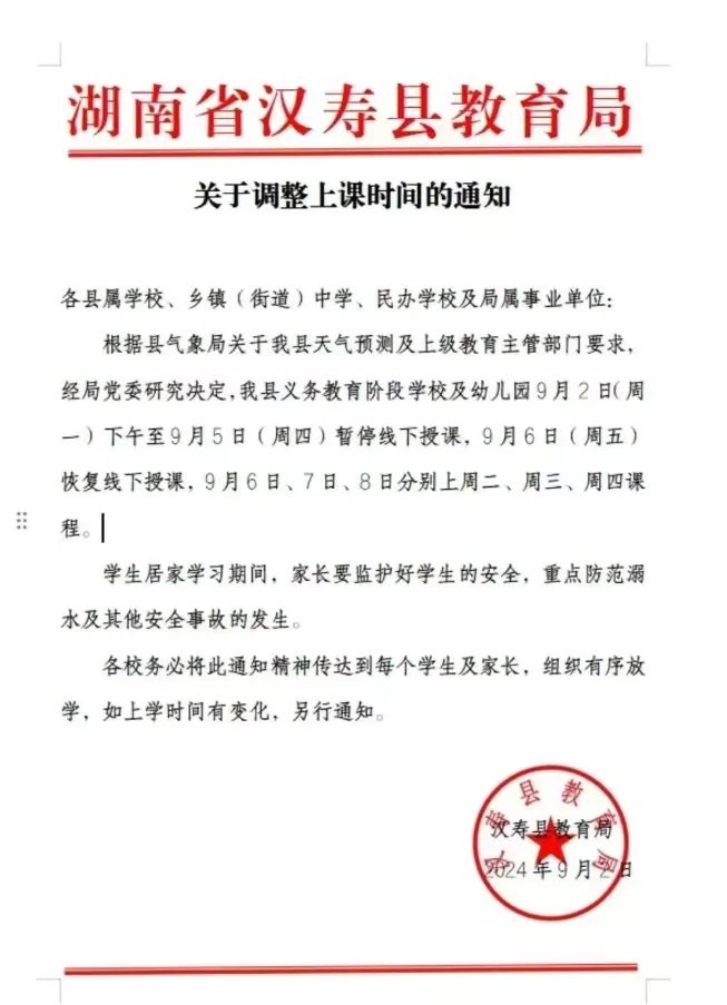 常德市汉寿县教育局发布《关于调整上课时间的通知》,称9月2日下午至9月5日,该县义务教育阶段学校和幼儿园暂停线下教学,9月6日恢复线下教学,9月6日、7日、8日分别上周二、周三、周四开设课程。在家学习期间,家长应对学生的安全进行监控,重点防止溺水和其它安全事故的发生。汉寿县教育局工作人员表示,上述通知不包括高中在内的义务阶段学校和幼儿园。
