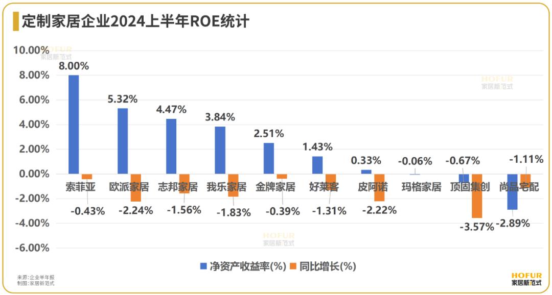 从股东回报的角度来看,龙头企业也远高于其他家庭,这直观地反映在ROE(净资产回报率)上。索菲亚以8.00%的回报率排名第一,欧洲家庭紧随其后5.32%。志邦家居、我乐家居、金牌家居、好莱客、皮阿诺都保持了正回报率,但玛格家居、顶固集创、尚品家居配送都走向了负回报率。