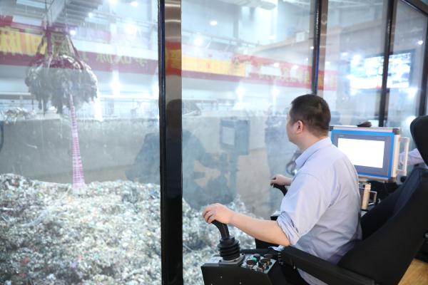 借助自动化系统,工作人员将发酵后符合焚烧标准的垃圾从坑里吊到垃圾焚烧炉。 来源:光大环保能源(苏州)有限公司