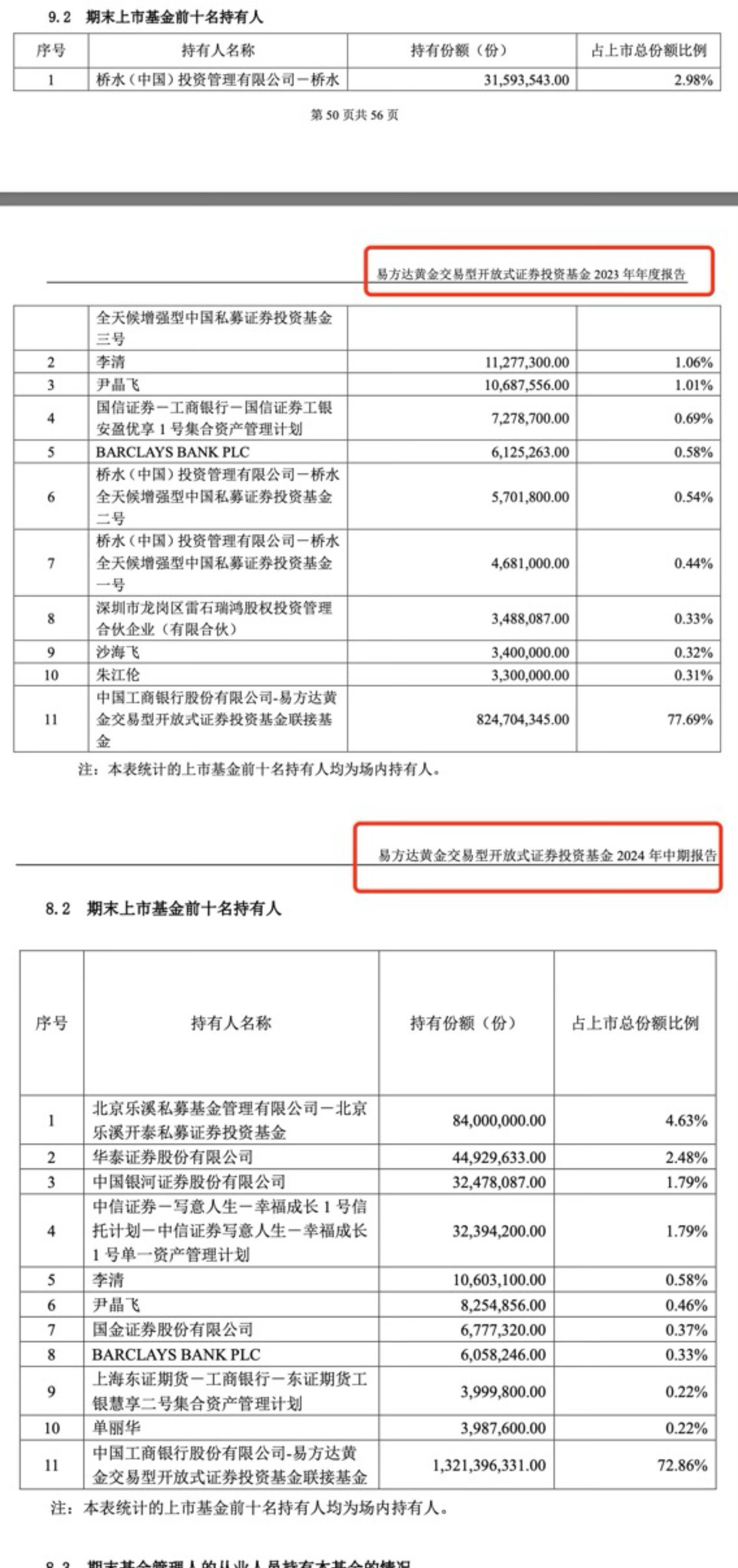 2024年博时黄金ETF中期报告显示,桥水基金也不再是前十大持有者之一。