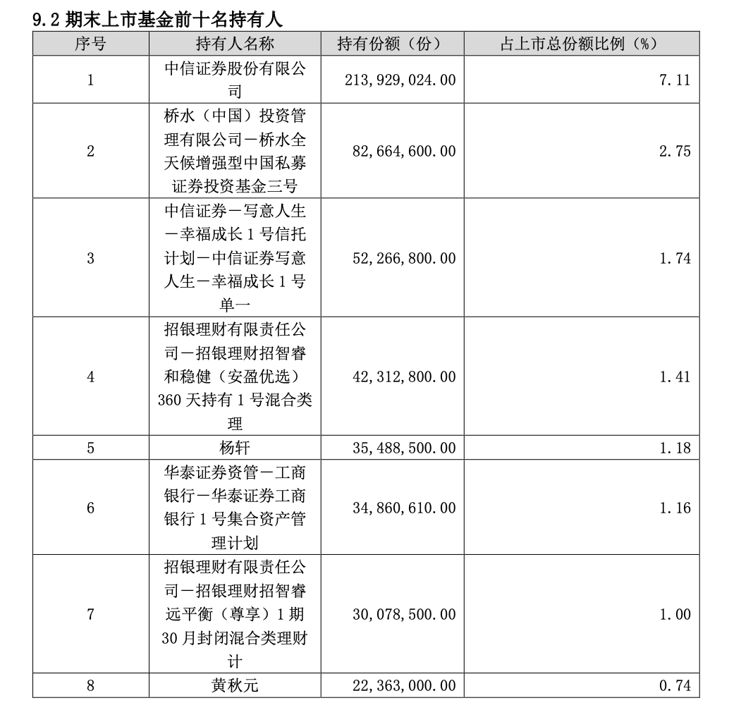 E基金ETF2023年度报告显示,截至2023年底,桥水(中国)投资管理有限公司-桥水全天候强化型中国私募股权投资基金三号,是该基金的第一大持有者,拥有3159.35万份股份;桥水(中国)投资管理有限公司-桥水全天候强化中国私募股权投资基金二号、桥水(中国)投资管理有限公司-桥水全天候加强型中国私募股权投资基金一号,依次位居第六、第七大持有人,分别持有570.18万份、468.1万份。