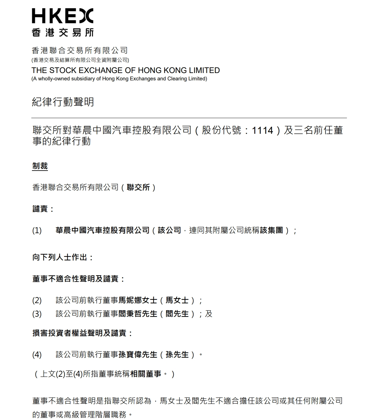 近日,根据香港联交所有限公司(以下简称联交所)官网消息,联交所发布了华晨中国汽车控股有限公司(01114).HK,以下简称华晨中国)和三位前董事的纪律行动,对企业前执行董事马妮娜和前执行董事阎秉哲作出不适时的声明和谴责;对企业前执行董事孙宝伟作出损害投资者权益的声明和谴责。