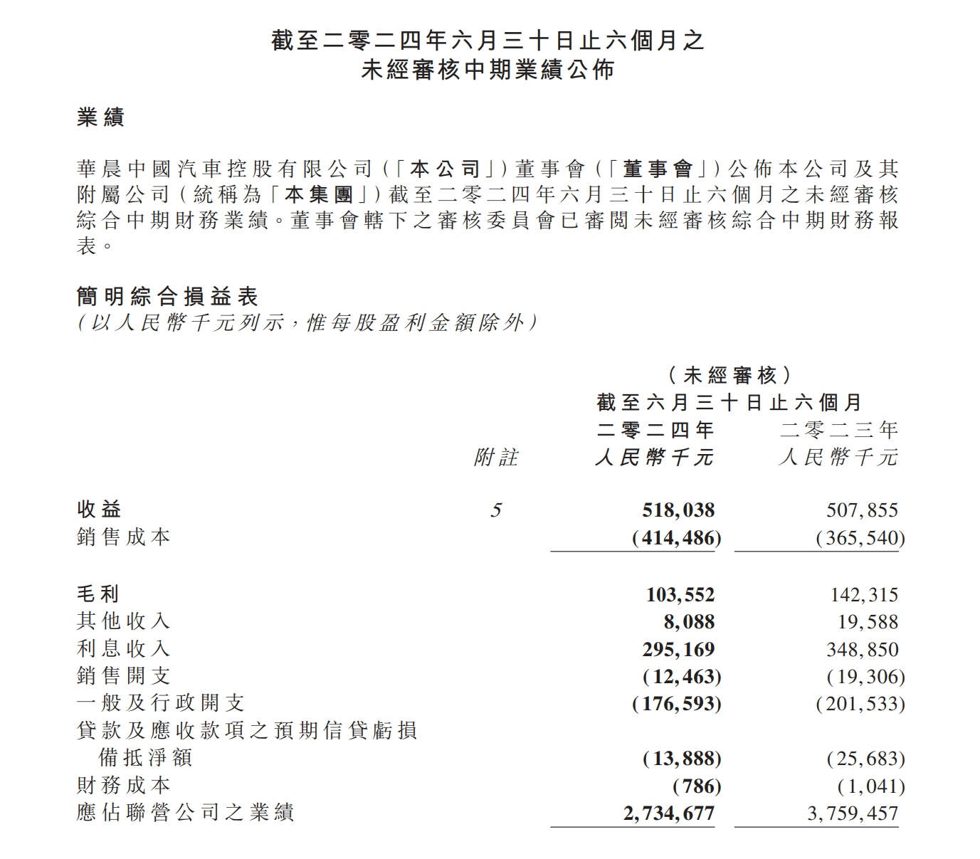 就业绩而言,上半年,华晨中国总收入约为5.18亿元,同比增长2.01%。;股东应占溢价约14.73亿元,同比下降60.65%。根据财务报告,华晨中国的主要利润来自联合公司华晨宝马汽车有限公司。财务报告显示,2024年上半年,联合公司为华晨中国带来了27.34亿元的业绩。