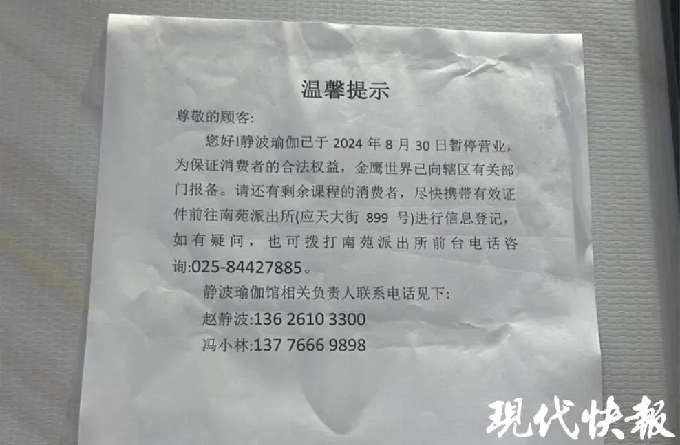 然而,住在建邺区金鹰世界4楼静波瑜伽店附近的徐女士说,她在这里填了年卡,总共花了1.5万多元。“8月28日,我还在店里上课,问了店员和教练。他们都让我放心,说金鹰世界的这家店会一直经营下去。”