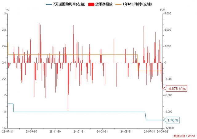 央行 9 月 2 日以固定利率、数量招标方式进行 35 亿元 7 天期逆回购操作,操作利率 1.70%。Wind 数据显示,当天 4710 逆回购到期1亿元。