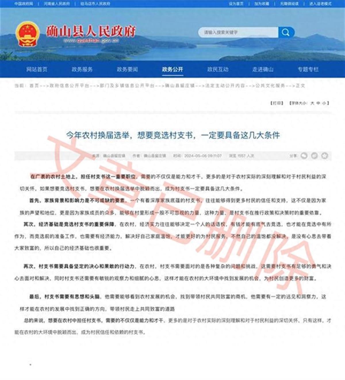 9月2日晚,在河南省驻马店市确山县政府官网上,一篇关于确山县留庄镇的文章作者进行了讨论。文章称,选举村主任应具有家庭背景和影响力。3日上午,留庄镇政府办公室工作人员告诉极目新闻记者,文章中的相关言论是虚假的,已经删除,现在正在寻找来源。