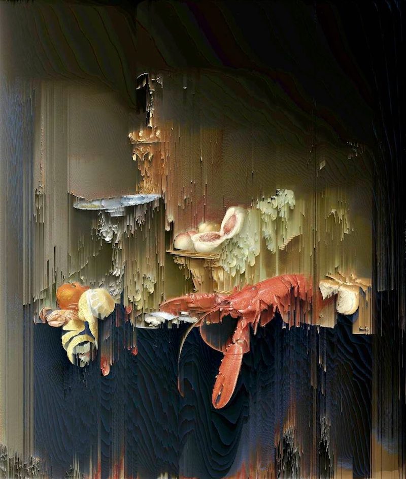 静物画在英国的起源可以追溯到荷兰,就像很多其它美好的东西一样,静物画也是一种舶来品。早期的静物画属于“虚无主义”,将凡俗物体与死亡象征物一起绘制,也有纪念“死亡”的传统。展览开头悬挂着几幅古老的静物画,与现代作品进行了对话。 帕特里克·考尔菲德(Patrick Caulfield)亚克力画《预留的桌子》( Reserved Table ,2000年)引用了荷兰黄金时代画家威廉·卡尔夫(Willem Kalf)圣塞巴斯蒂安弓箭手协会的饮酒角、龙虾和玻璃静物( Still Life With the Drinking-Horn of the Saint Sebastian Archers’ Guild, Lobster and Glasses,大约1653年),与后者的灵感相比,前者只是一种廉价的视觉插科打诨。但是当你看到马特·科利肖的时候(Mat Collishaw)德克萨斯州死囚中的最后一餐”( Last Meal on Death Row, Texas ,2012年),作品从远处看似来自一位老大师,但实际上却是一幅数码转印作品。一旦你知道它描绘的异国水果代表了一个真正的囚犯在注射死刑前不久提出的要求,它那一尘不染、香甜可口的表面就会化为乌有。