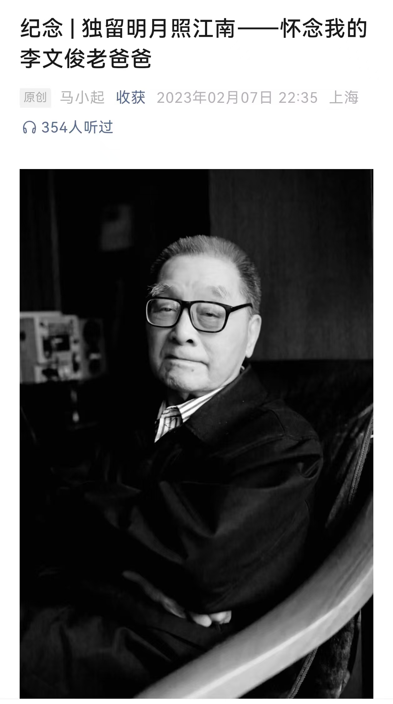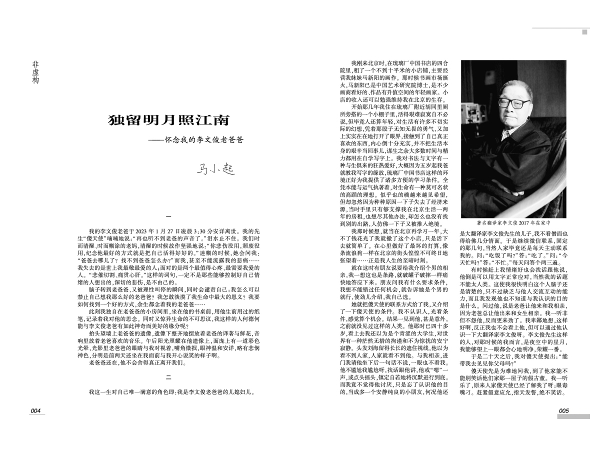 她不喜欢被过度关注。2023年,作为“翻译家李文俊的儿媳妇”,马小起开始为更多陌生人所知,因为《收获》上发表的一篇文章《独居明月照江南——想念我的李文俊爸爸》。
