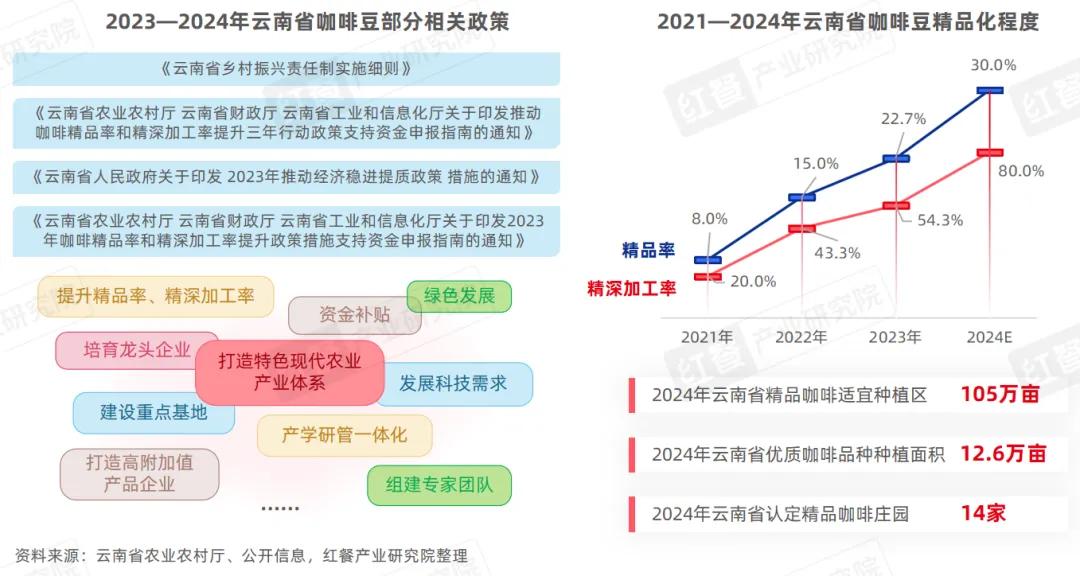 云南当地政府为咖啡豆产业的发展提供政府支持。近年来,出台了许多目的性政策,为提高咖啡豆产量、深度加工率、培育龙头企业、建设重点基地、绿色发展等提供政策和资金支持。,并通过协同创新的方式推动云南咖啡豆产业全链条发展。