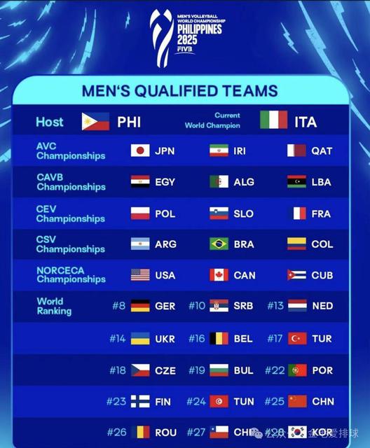 主办国菲律宾和世界锦标赛卫冕冠军意大利占据2个名额,其次是各大洲的前三名。